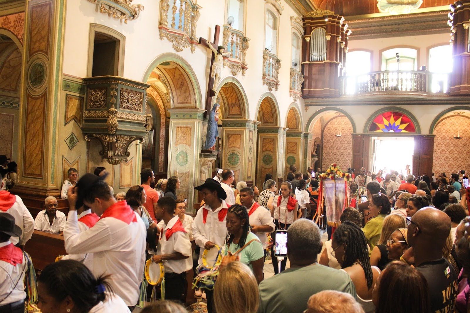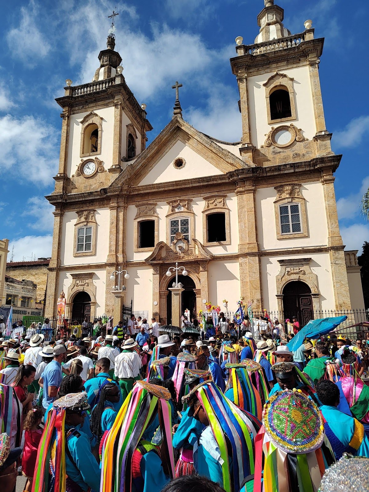 No domingo pela manhã, ao longo da avenida Padroeira do Brasil e da rua Barão do Rio Branco, além de outras vias do entorno da Igreja de São Benedito, especialmente, os grupos de congada foram recebidos com café da manhã e se dirigiram, em seguida à praça onde seria realizada a Missa Conga, uma celebração católica com elementos musicais afro-brasileiros, presidida pelo padre Vanderlei Sousa. Nessa ocasião, pude identificar a presença da Irmandade dos Arturos, um quilombo da cidade de Contagem, Minas Gerais. Antes, no sábado, já tinha visto os bastante conhecidos reinados das comunidades quilombolas de Nossa Senhora do Rosário de Justinópolis (Ribeirão das Neves) e do Jatobá (Belo Horizonte). A celebração destacou a robusta presença mineira, exaltou a importância do catolicismo popular e dos diversos signos da ancestralidade africana que fortalecem os laços entre esses grupos provenientes, muitas vezes, de pequenas cidades de dez mil habitantes e que, por vezes, podem se sentir isolados. Em sua homilia, o celebrante ressaltou esses sentidos, bem como fez um verdadeiro manifesto antirracista a partir de referências católicas. O público presente à missa ocupava quase todos os cantos da praça em frente à Igreja, o próprio templo, o piso superior da rodoviária, contígua à praça, que servia como uma espécie de camarote. Nas ruas laterais, a celebração convivia com as barracas da festa e os bonecões conhecidos das festas valeparaibanas: José Paulino e Maria Angu.