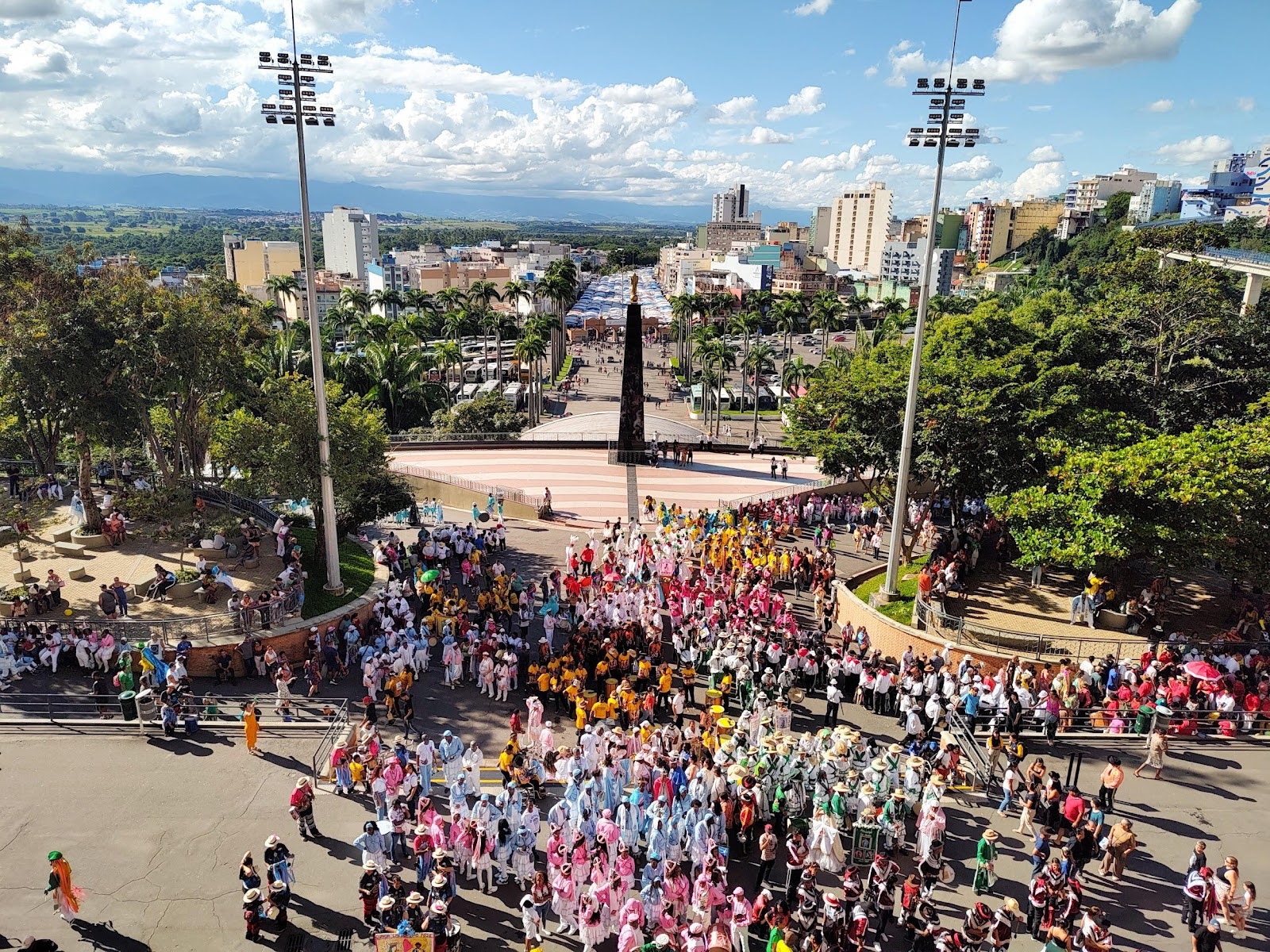 Acompanhei os dias finais da festividade, que em Aparecida tradicionalmente começam na segunda-feira depois da Páscoa (21 de abril em 2025) e seguem até a segunda-feira seguinte. Este período de realização da festa já tinha sido destacado por Alceu Maynard Araújo para os anos 1940/50 a respeito de certas devoções oficiais a São Benedito na região do Vale do Paraíba. Nos dias finais da festa (da manhã do sábado à noite da segunda-feira), ocorre também o Encontro Nacional de Congadas, em 2025 com a presença de aproximadamente duzentos grupos — congadas, moçambiques, catupés, marujadas etc. — que ficam alojados em hotéis, pousadas e escolas públicas nas cercanias dos principais templos católicos de Aparecida, como o Santuário Nacional, a Basílica Histórica, a Igreja de São Benedito e a Capela de Santa Rita.