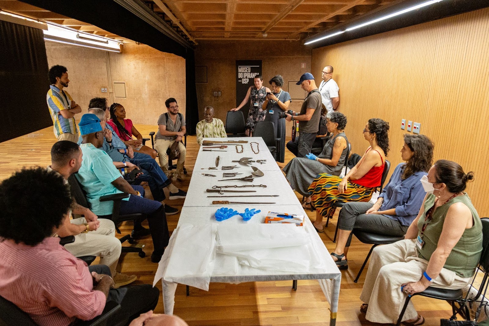 A história desses objetos, violentamente retirados de suas casas, de seus territórios sagrados, ganha a possibilidade de um reencontro a partir do Encontro de Terreiros no Museu Paulista, cujo início, bastante significativo, foi a promoção de um contato direto entre babalorixás, sacerdotes de religiões afro-brasileiras, pesquisadores e interessados. Considerando em especial a presença de José Adário dos Santos, mais conhecido como Zé Diabo, babalorixá e ferreiro baiano, bem como a maior estabilidade, em termos de conservação, dos objetos em metal, os priorizamos para esse momento de diálogo. Grande parte dos que foram postos à disposição desse grupo são os provenientes dos terreiros baianos, que nos anos 1980/1990 foram transferidos do Museu Paulista para o Museu de Arqueologia e Etnologia da Universidade de São Paulo (MAE-USP), por não terem sido considerados, à época, pertinentes a um museu de História, mas de Etnologia. Aliás, agradecemos muito ao diretor do MAE/USP, Eduardo Neves, pela autorização do empréstimo e a Carla Gibertoni, Rosa Vieira e Meliam Gaspar pela parceria e participação nessa roda de conversa.