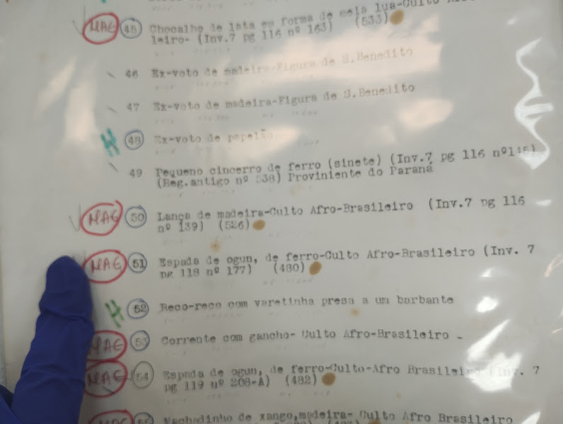 Parte de uma das páginas da lista de objetos transferidos do Museu Paulista para o Museu de Arqueologia e Etnologia. Observe na linha nº 53 a denominação “Corrente com gancho – culto Afro-Brasileiro”. Foto: Aline Montenegro, 2024