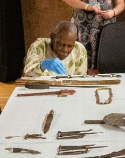 Os objetos foram colocados sobre uma grande mesa e na medida em que eram apresentados, S. Zé Diabo e Tat’Etu Lengulukenu, sacerdotes do Candomblé iam identificando-os, explicando seus usos e significados sagrados. Tudo foi devidamente registrado.