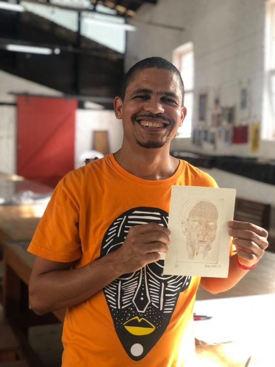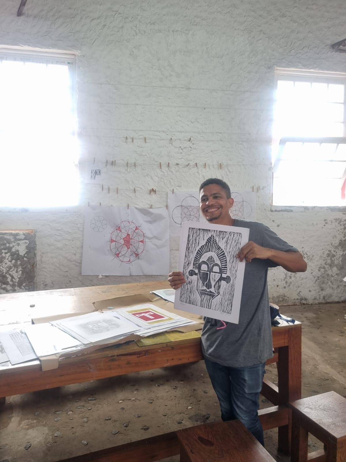 Encantado com o potencial das Oficinas do MAM, Bruno trabalha com diversas técnicas de gravura e hoje, além de mediador da exposição, é professor de diferentes oficinas, no MAM e no Acervo da Laje (outro projeto que sou encantada, assunto para outro post). Ele me conta com os olhos brilhantes tudo que Lina sonhou para o espaço e o que faz sentido para ele: educar, emancipar, recriar. Fomos, então, à Oficina. Um amplo espaço de criação, onde conheci várias produções de seus alunos, além de obras próprias. Uma impressionante coleção de xilogravuras, gravuras em metal, litografias e serigrafias, que passa despercebida dos visitantes apressados. Aqui, outro colega da educação, o França, vem conversar conosco e fico sabendo que, apesar de ser Dia do Trabalho, eles tiveram que vir sem nenhum apoio institucional, sujeitos à violência dos pontos de ônibus completamente desérticos. Além disso, França trazia seu filho pequeno por não ter onde deixar no feriado. Pareceu-me que suas carreiras e trajetórias não eram devidamente reconhecidas pelo MAM e vislumbro da mesma forma baixos salários. Mas não quis verificar minhas hipóteses, apenas registrei, com certa inconformidade, como os educadores de museus continuam a ser desvalorizados, ao mesmo tempo que uma visita extremamente impactante, criativa e dialógica estava sendo costurada com tanta atenção, afeto e cumplicidade. Rimos juntos, para não chorar.