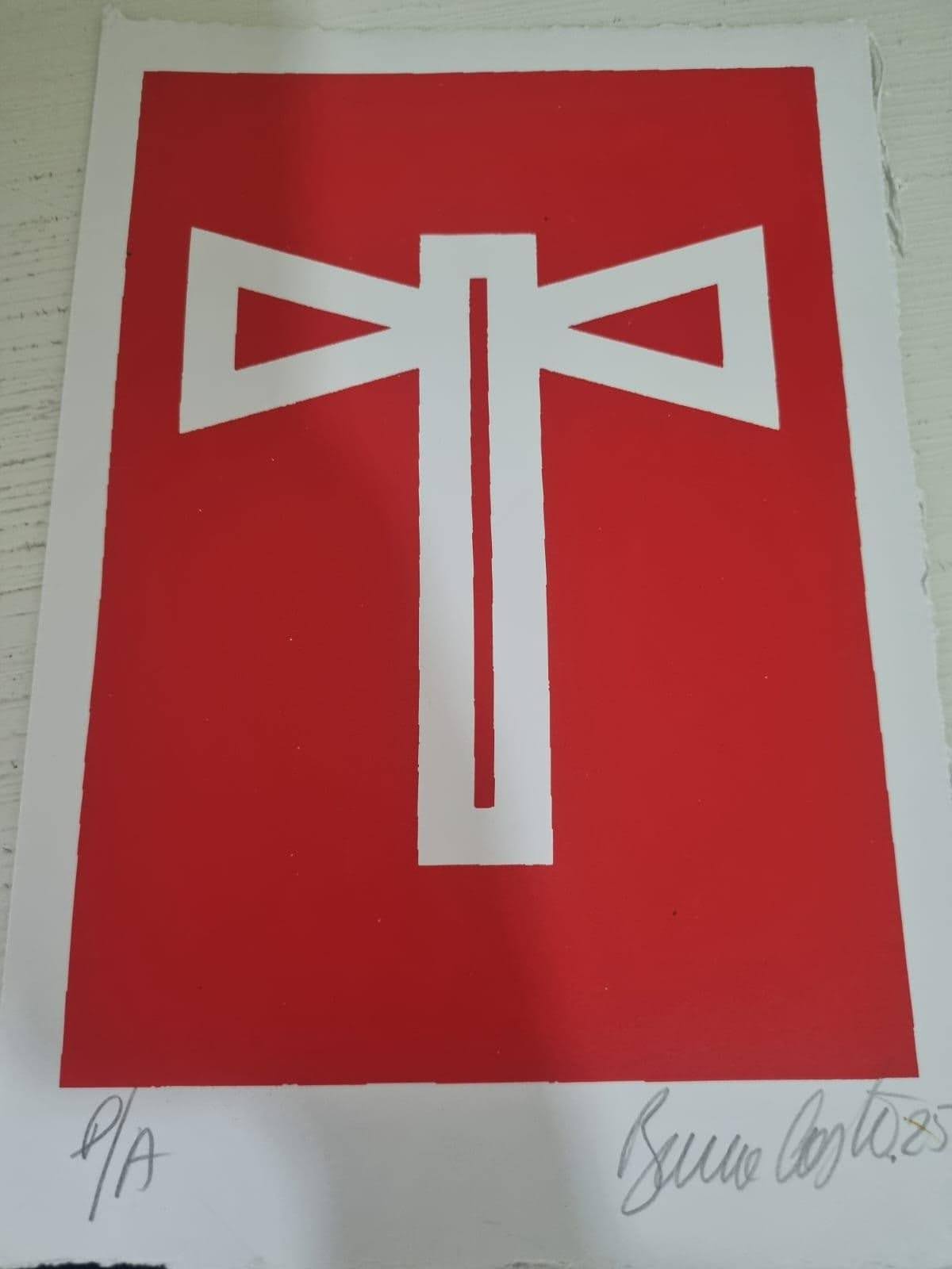 Meu telefone tocou inúmeras vezes ao longo dessa visita-papo-encontro-conexão e tive que explicar (sem atender, claro) que era meu aniversário. Para minha surpresa, Bruno escolheu uma de suas obras e assinou para mim, presenteando-me. Uma representação de Oxé, um machado de duas lâminas de Xangô, orixá relacionado com a justiça, o fogo e o trovão.