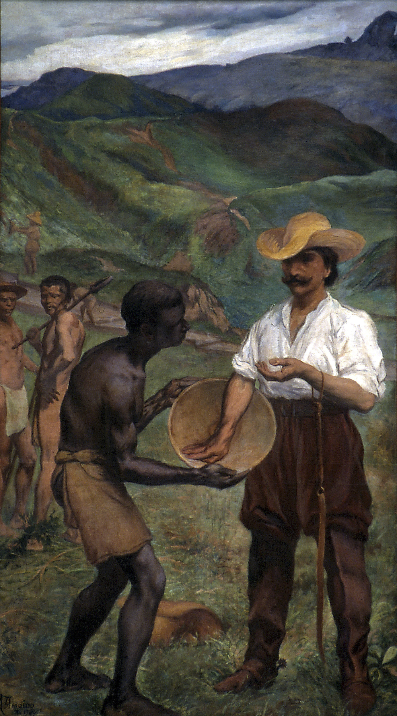 Em 13 de março de 1922, Afonso Taunay, então diretor do Museu Paulista, encarregado de preparar a instituição para as comemorações do centenário da Independência do Brasil, escreve ao professor da Escola Nacional de Belas Artes, Rodolpho Amôedo, sobre o andamento da confecção de um dos quadros encomendados para aquela ocasião: “(…) Muito boa concepção de grupo. Em lugar da picareta é bom por o almocafre às mãos do índio. Neste quadro peço de que ponha índios e negros. (…)”. Tal correspondência segue por dois anos com exigências sobre a paisagem do morro do Itacolomy e inúmeras cobranças de Afonso Taunay para apresentar a atividade mineradora, porém sem detalhe adicional sobre as figuras humanas da composição da obra. Essa troca de cartas deu origem a uma das imagens mais racistas das paredes do Museu do Ipiranga – tombada como parte do conjunto da decoração do edifício na condição de Patrimônio Histórico: o quadro “Ciclo do Ouro”, que foi entregue em 1924. Um negro escravizado, descalço e vestido apenas com um pano que cobre a parte de frente da coxa, se curva oferecendo o que coletou numa bateia de mineração ao bandeirante – homem branco, mais alto, postura ereta, vestimenta completa, botas e um chicote pacificamente pendurado inerte no pulso, seu rosto muito tranquilo dirigido a nós, o público. O indígena com o almocafre está alí ao fundo, também seminu, descalço e com postura curvada. São figuras metonímicas que representam, segundo o próprio Afonso Taunay, uma das “fases capitais da história nacional”, e não personagens históricos específicos. A imagem, como outras do mesmo conjunto decorativo, incomoda qualquer um que tenha um mínimo letramento e sensibilidade contra o racismo, se tratando de um forte retrato da subserviência e da submissão da presença afrodiaspórica e dos povos originários em nosso território.