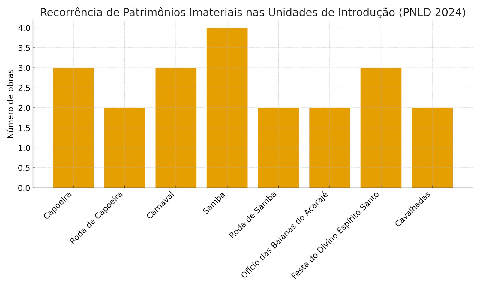 Outro ponto relevante é a presença de elementos de religiosidade popular, como a Festa do Divino Espírito Santo, as Cavalhadas e o Ofício das Baianas do Acarajé. Esse conjunto mostra que os livros não se restringem à cultura urbana moderna, mas também reconhecem expressões tradicionais ligadas à fé, ao território e às práticas culinárias. Ainda assim, sua frequência é menor do que a dos símbolos mais midiáticos (samba e carnaval), o que sugere uma hierarquização do que se entende como patrimônio imaterial mais “representativo” do Brasil.